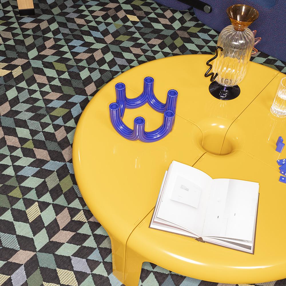 Four identical elements that can be arranged side by side or stacked using special inserts to create coffee tables or modular bookcases. Made from injection-moulded ABS plastic.
