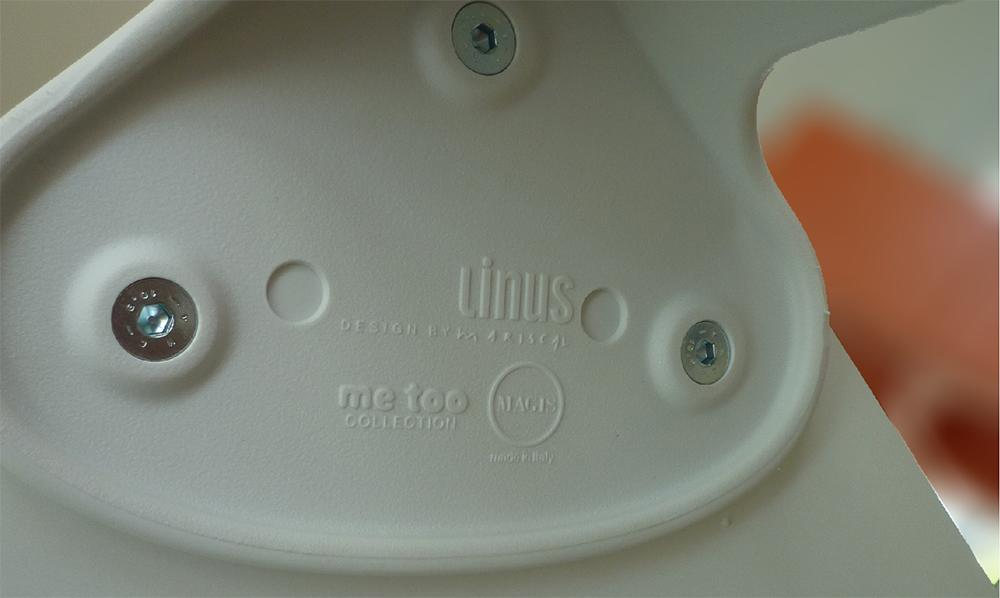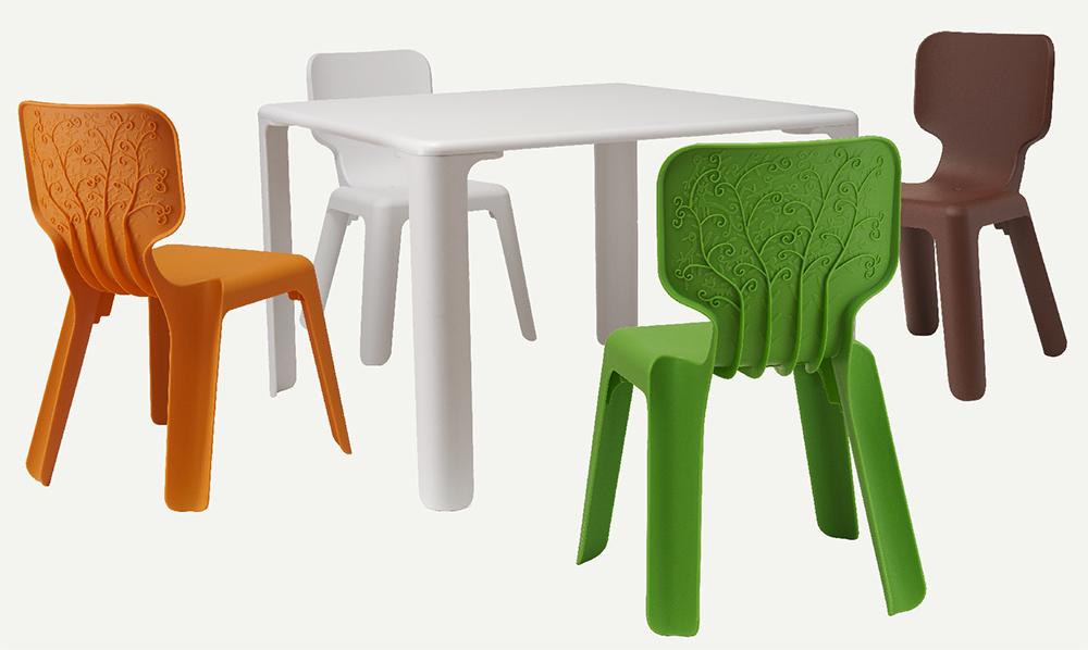 Linus is a children's table with legs made of standard injection-molded fiberglass-filled polypropylene. The MDF tabletop is covered with a polymer sheet.