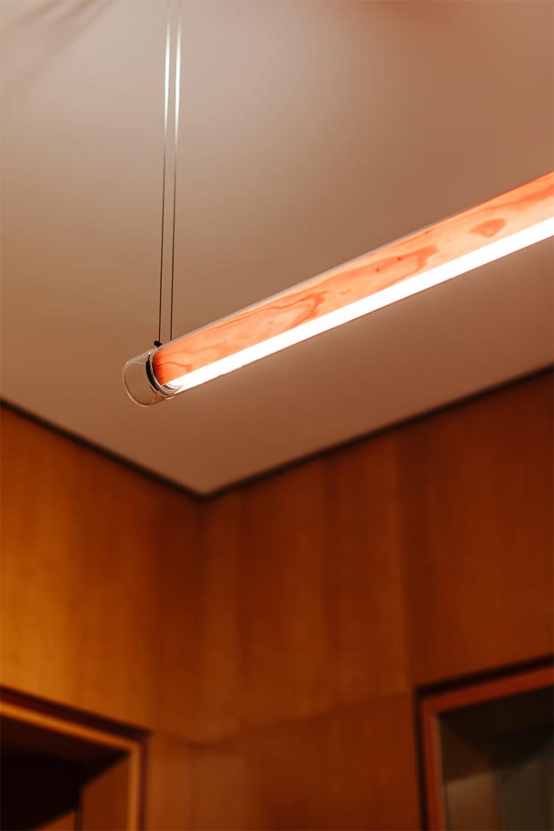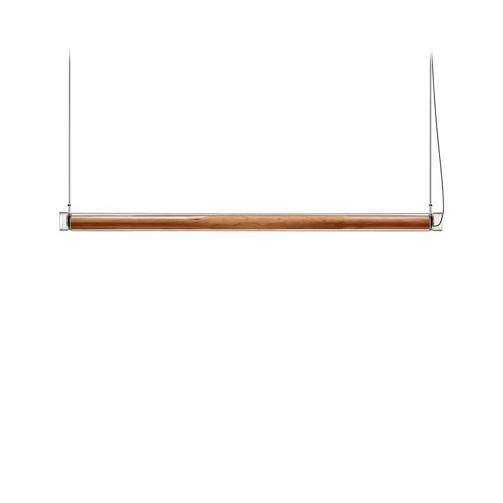 Estela Horizontal Lzf is a suspension lamp. Estela is a captivating capsule of light. In Estela, Mayice designed a clean, clear, single piece of borosilicate glass. Hand-blown by the accomplished artisan Eduardo Garuti, the glass envelopes a cylinder-like wood veneer diffuser. The wood veneer houses a dimmable LED light source, and a straight opening on one side emits downward light that is softened by the glass.