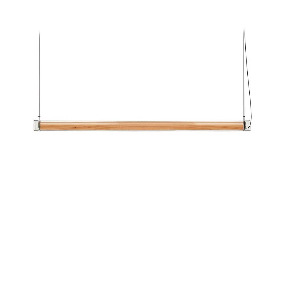Estela Horizontal Lzf is a suspension lamp. Estela is a captivating capsule of light. In Estela, Mayice designed a clean, clear, single piece of borosilicate glass. Hand-blown by the accomplished artisan Eduardo Garuti, the glass envelopes a cylinder-like wood veneer diffuser. The wood veneer houses a dimmable LED light source, and a straight opening on one side emits downward light that is softened by the glass.