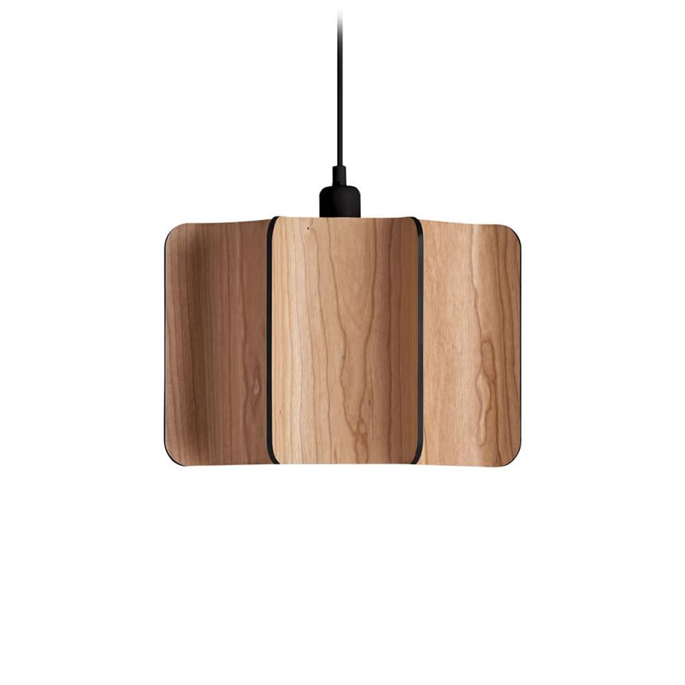 To create the shape, panels of wood veneer are arranged in a vertical concave fashion around the light source and held in place by an acrylic frame. Each piece of veneer beautifully reflects the light from within this pleasing lamp.