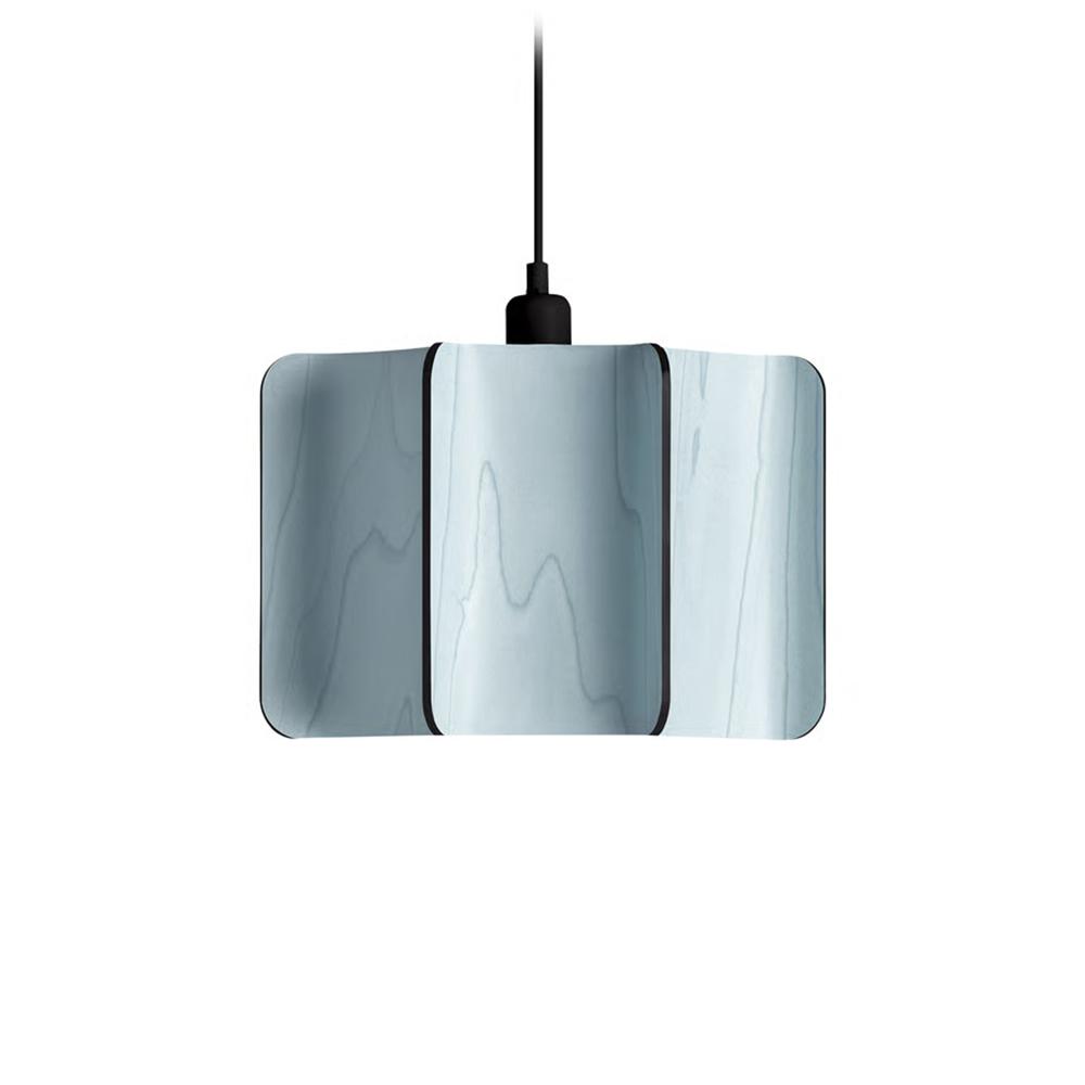 To create the shape, panels of wood veneer are arranged in a vertical concave fashion around the light source and held in place by an acrylic frame. Each piece of veneer beautifully reflects the light from within this pleasing lamp.