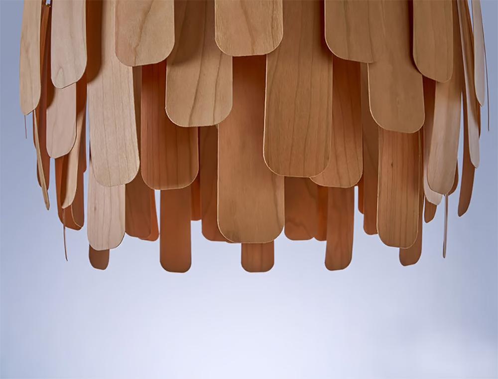 Maruja Lzf is a suspension lamp. The do-it-yourself Maruja is packaged with all the components needed to assemble the lamp: wood veneer strips (in several sizes), a circular frame, and pins. Maruja is easily constructed, without the need for any tools or adhesives. Using a pin, each wooden strip is clipped onto the circular frame—insert a light bulb, and you will have created an elegant, handmade lamp. The wood veneer strips hang and move freely, and when illuminated, Maruja sparkles with life. The canopy has a Matt white finish.