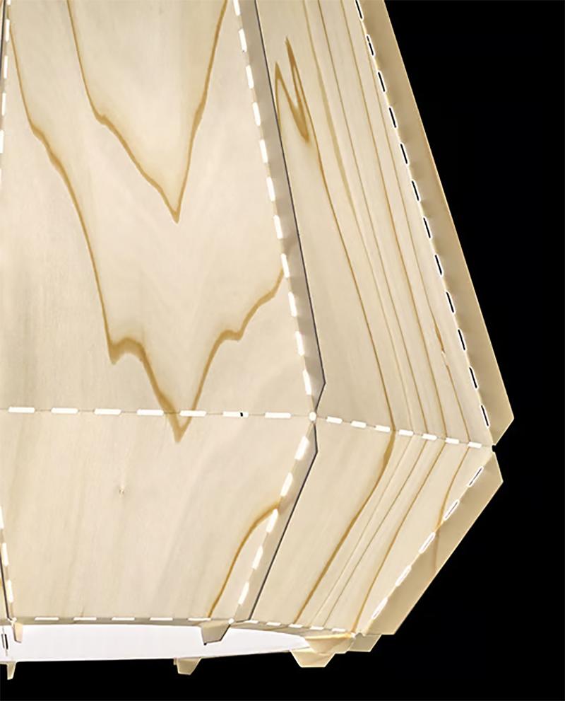 Stitches is a family of two suspension lamps designed by Egbert-Jan Lam of Netherlands-based Burojet Design Studio: Stitches Bamako and Stitches Tombuctú each have a distinctive embroidery-like pattern. To make these lamps, veneer strips are crafted in a traditional sewing-style fashion. In the same way that a garment is traditionally finished with a hem, the Stitches lamp has a visible hemstitch that is accentuated when lit.