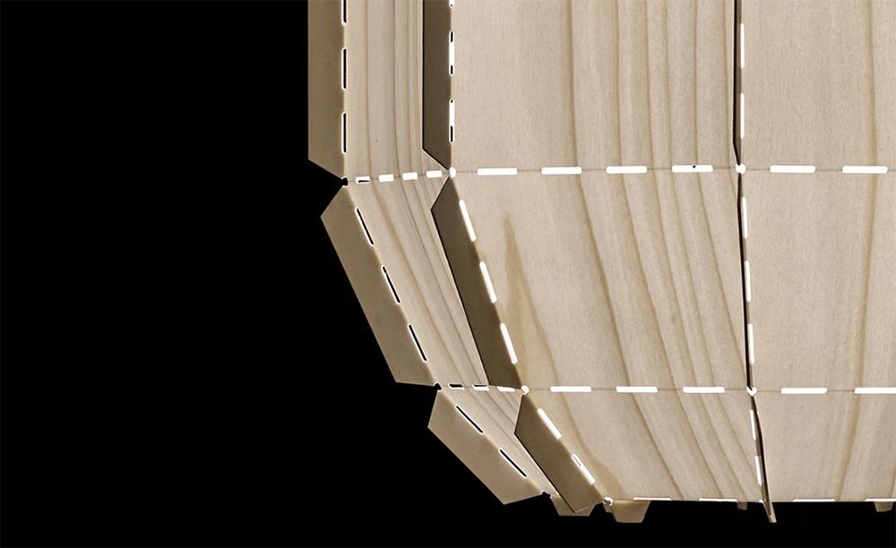 Stitches is a family of two suspension lamps designed by Egbert-Jan Lam of Netherlands-based Burojet Design Studio: Stitches Bamako and Stitches Tombuctú each have a distinctive embroidery-like pattern. To make these lamps, veneer strips are crafted in a traditional sewing-style fashion. In the same way that a garment is traditionally finished with a hem, the Stitches lamp has a visible hemstitch that is accentuated when lit.