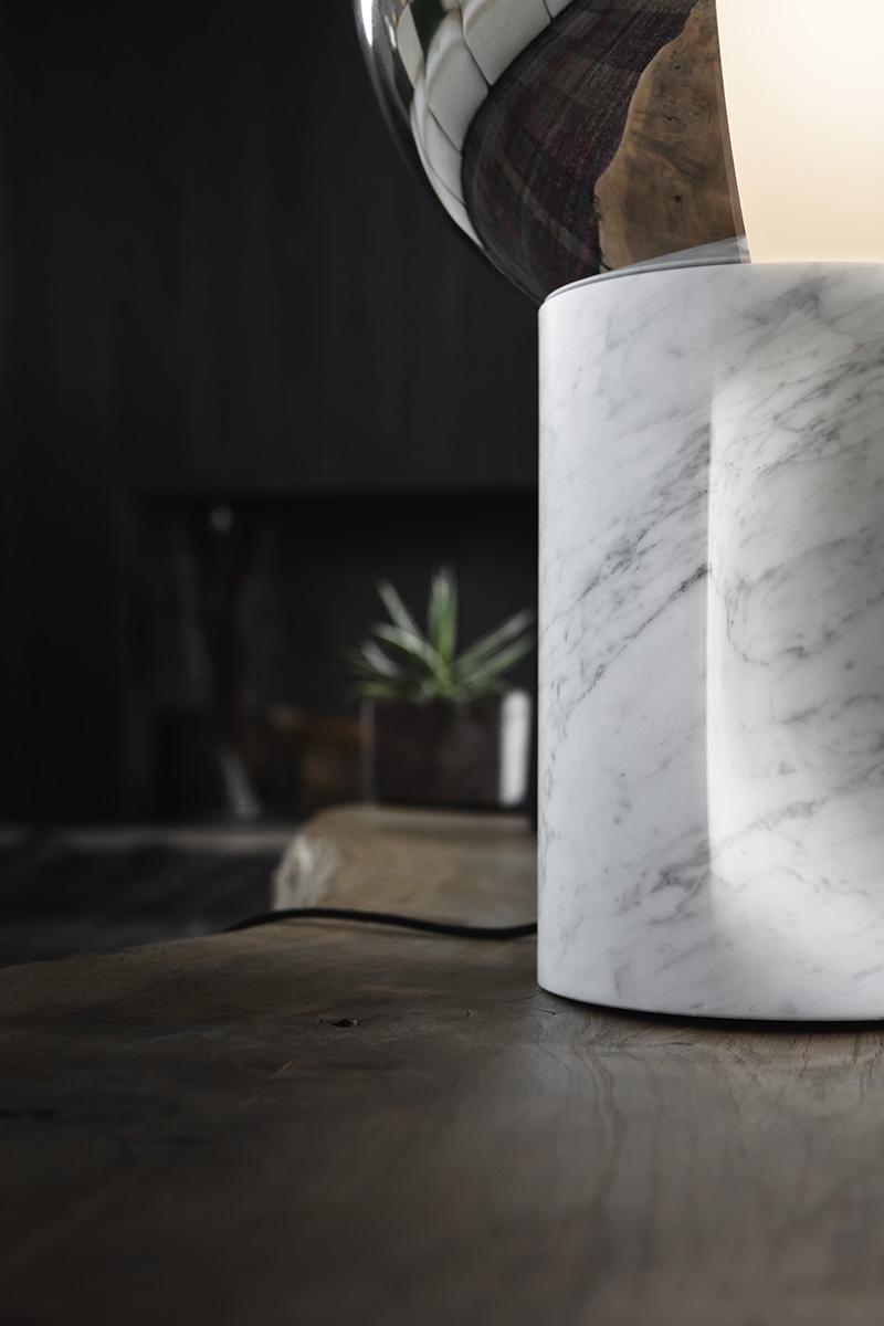 Je suis Penta, a sculptural lamp formed by a two-coloured sphere in white and silver glass and by a monumental Carrara marble or wood base. Je suis is a declaration of intents, with its rich finishings and the beauty beyond functionality. Integrated LED 17,5W 3000K, dimmer on cable.