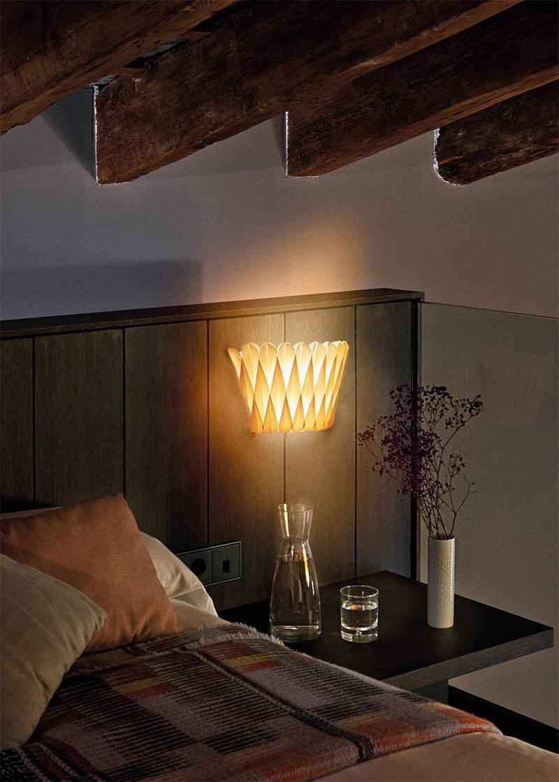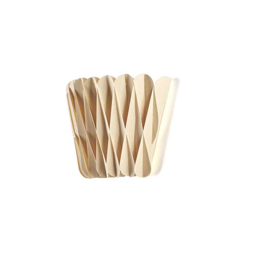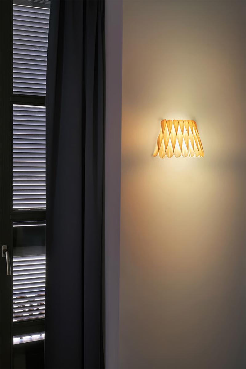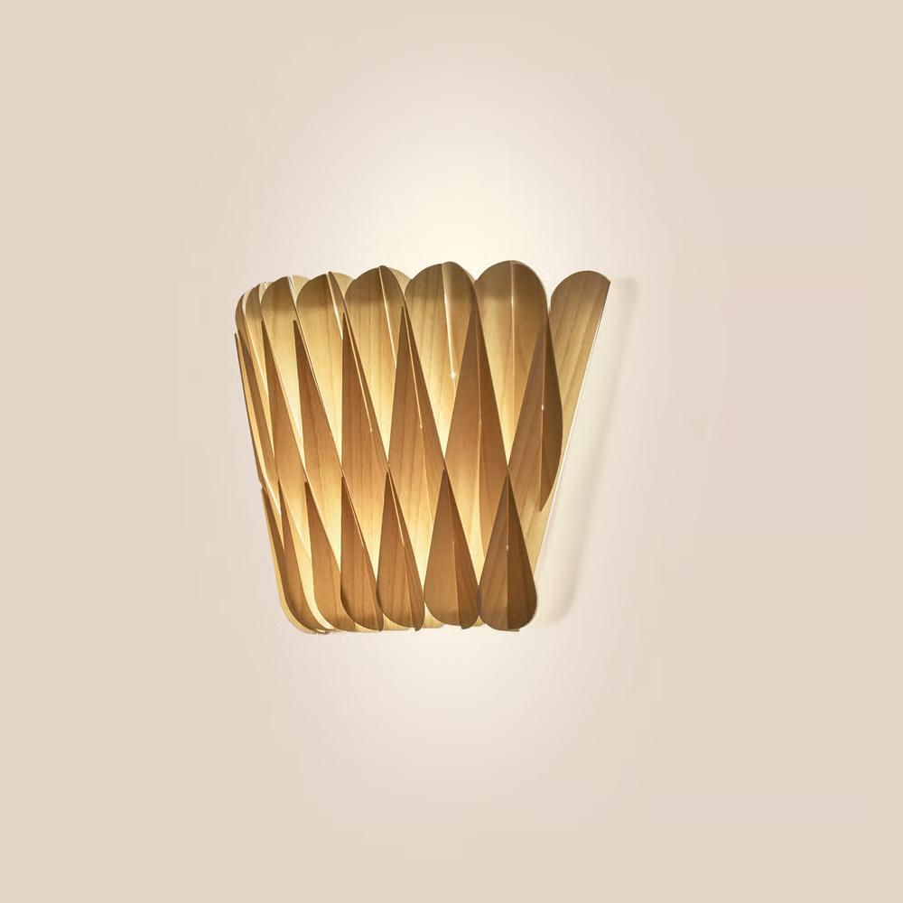Lola Lzf is a wall lamp. Designed by Ray Power, Lola showcases the designer’s ability to create imaginative three-dimensional forms. Lola is a conical lamp with an intricate geometric pattern. A veritable labour of love, Lola’s shape went through many iterations, drawings and prototypes, before arriving at the finished form. A particularly piquant Spanish name, Lola is very much alive, sensuous, and intriguing. An avant-garde lamp, Lola’s complex woven veneer construction is beautifully accentuated when lit.