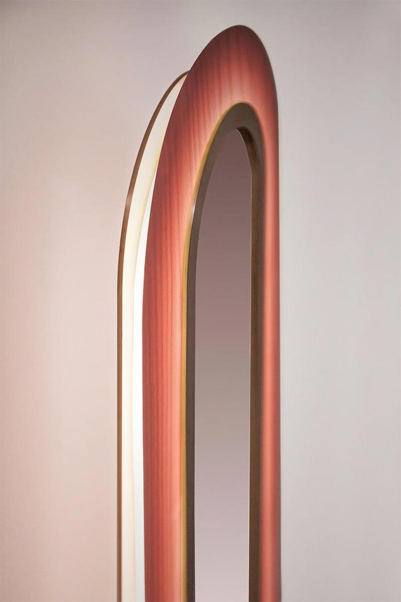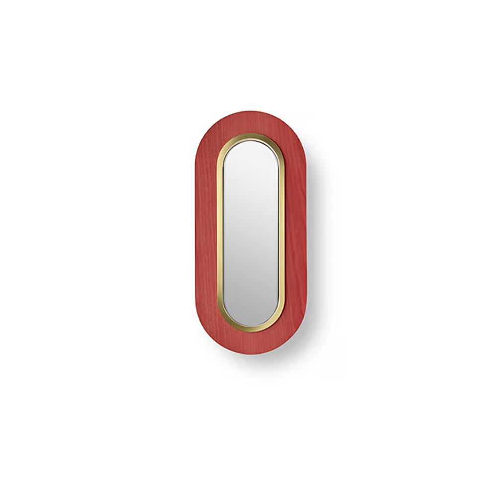 The Lens Oval Wall is available in the following wood veneers: Natural Cherry, Ivory White, Natural Beech, Yellow, Orange, Red, Blue, Grey, Pale Rose, and Sea Blue. The metal finishes are Black, Matt Ivory or Gold.