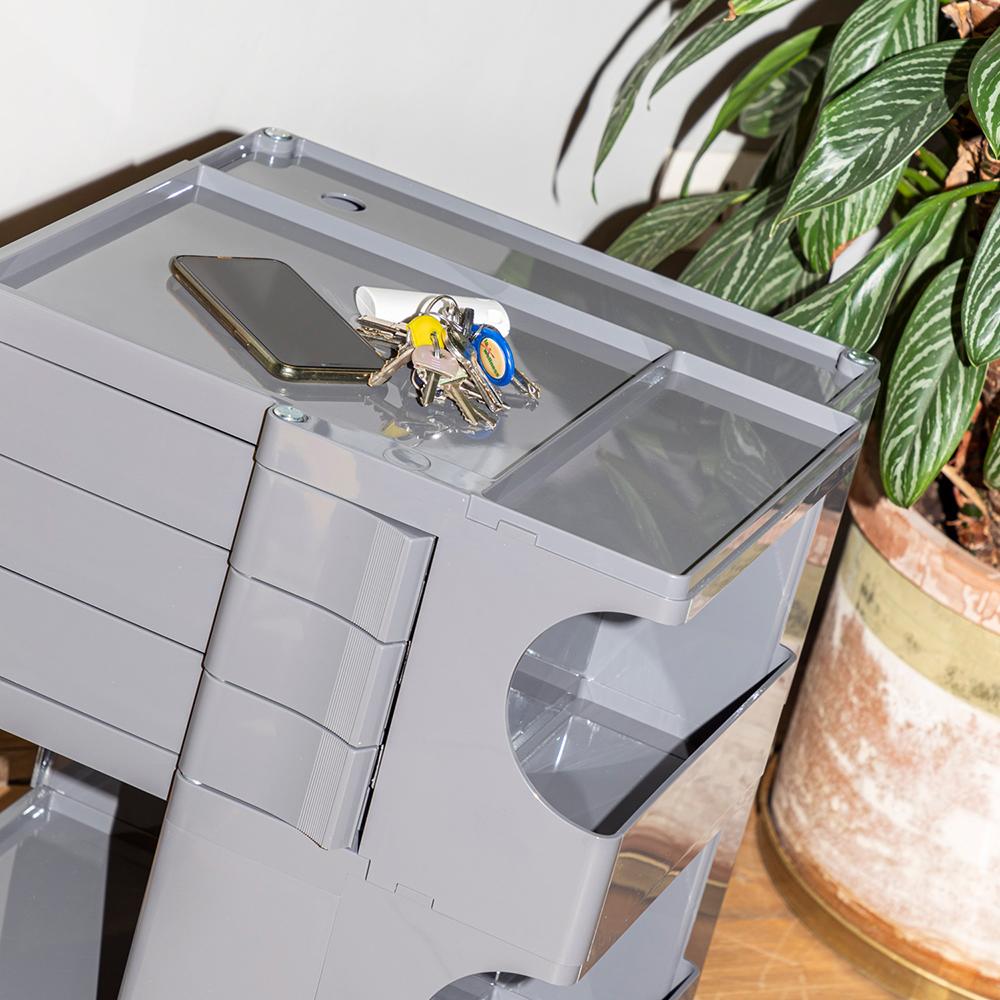 Icône historique du design, le chariot-armoire Boby B-Line se distingue par son approche dynamique et sa grande flexibilité. Conçu pour garantir une composition verticale simple, il permet d’obtenir différentes configurations avec des capacités personnalisées. La structure en ABS, composée de modules avec tiroirs et étagères, est montée sur 5 roulettes pivotantes en polypropylène et propose 4 solutions en termes de hauteur. Il fait partie de la collection permanente du MoMA de New York et de la Triennale de Milan, Prix Smau en 1971. Sur demande, il est possible d'acheter l'étagère en contreplaqué ou en liège.