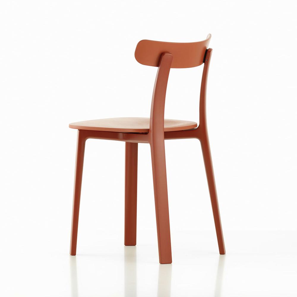 Le cadre plat de ce siège est moulé en une seule pièce, tandis que la mince surface d’assise est de forme organique et le dossier plus finement modelé que celui des chaises en bois classiques. Ainsi, le All Plastic Chair est remarquablement compact et gracieux, mais également très confortable grâce à la combinaison de différentes matières plastiques. Tandis que le cadre est constitué de polypropylène à haute ténacité, l’assise et le dossier s’adaptent aux contours du corps de l’utilisateur. De plus, le dossier est relié au cadre au moyen d’un axe et de tampons en caoutchouc et suit ainsi légèrement les mouvements de l’utilisateur.