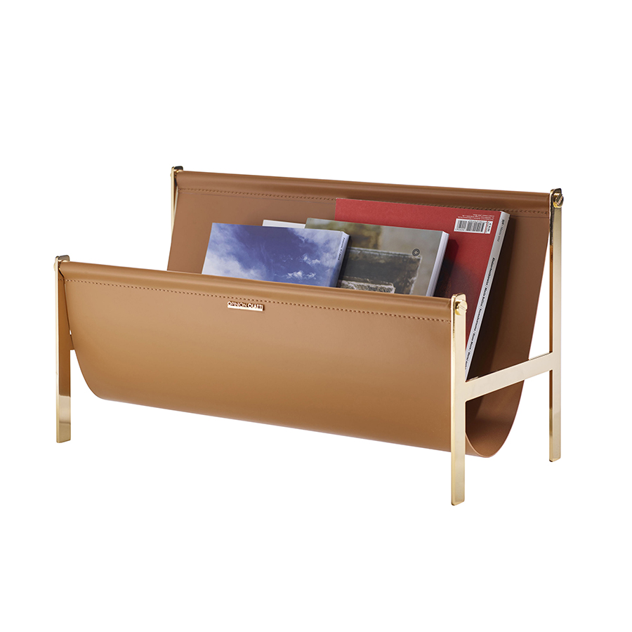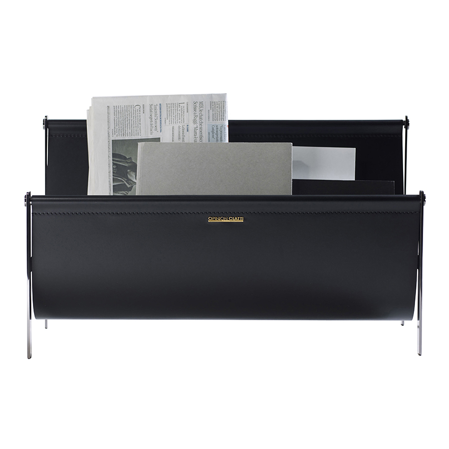 Porte-revues en cuir régénéré avec logo Opinion Ciatti et structure en acier. Finitions: cuir noir et structure en acier nickel noir, cuir naturel et structure en or 24 cts.