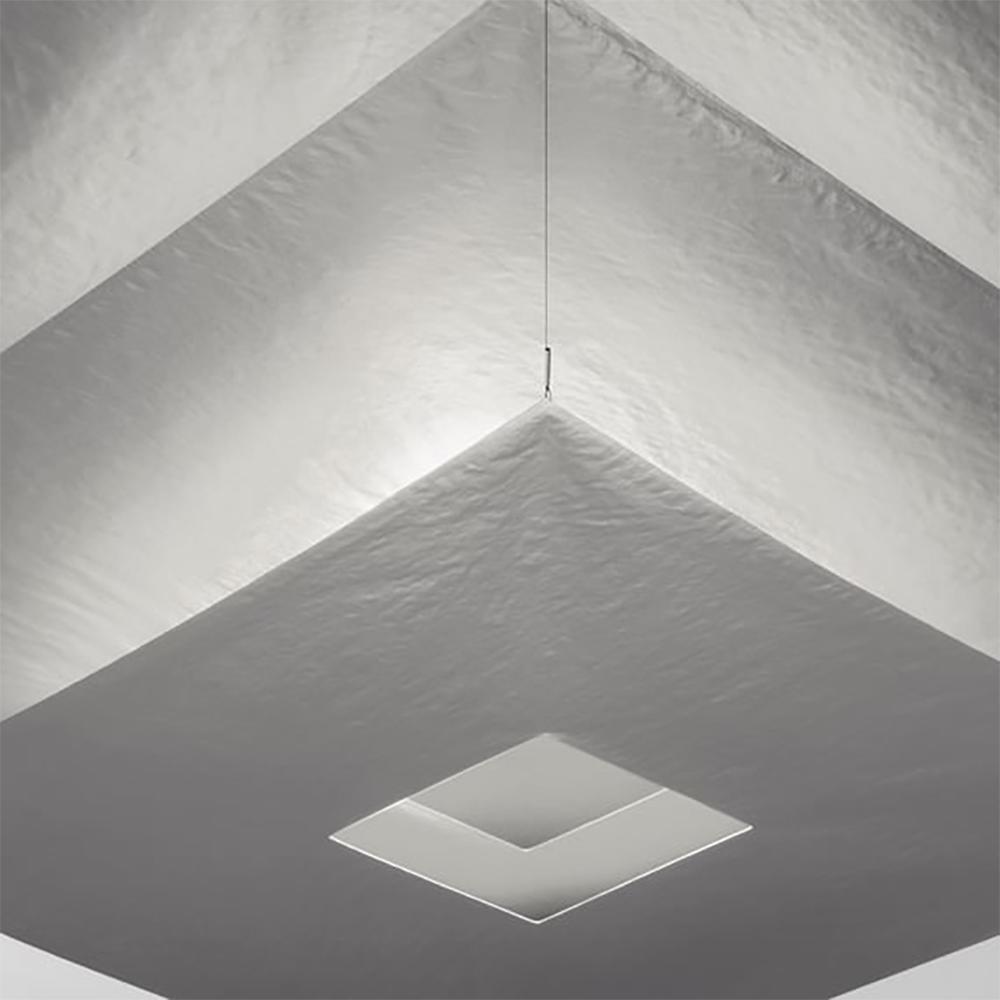 Papier laqué or ou blanc mat, aluminium. Suspension sur des câbles en polyester tressé.