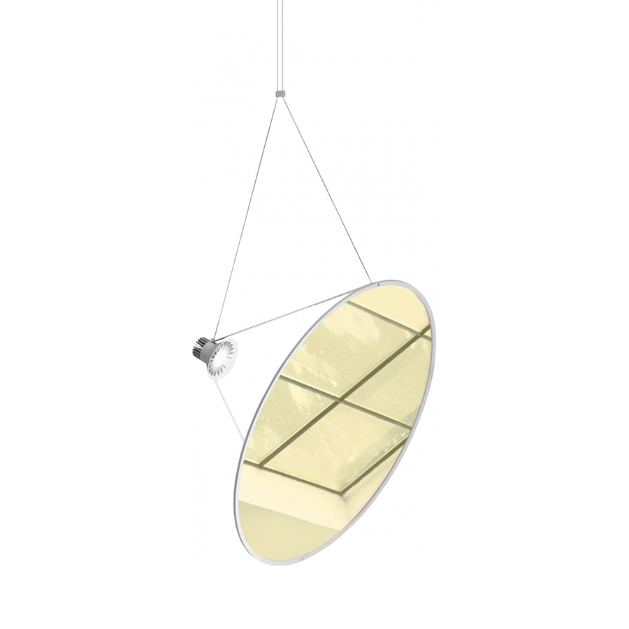 Comme une voile ensoleillée, une source de lumière incroyablement puissante, projetez un faisceau lumineux sur le grand disque léger, à la fois diffusant et réfléchissant la lumière. Le stock mince relie les deux éléments principaux. En modifiant la longueur et les points de connexion des deux fils de support, la rotation du disque peut être réglée à n'importe quel angle.