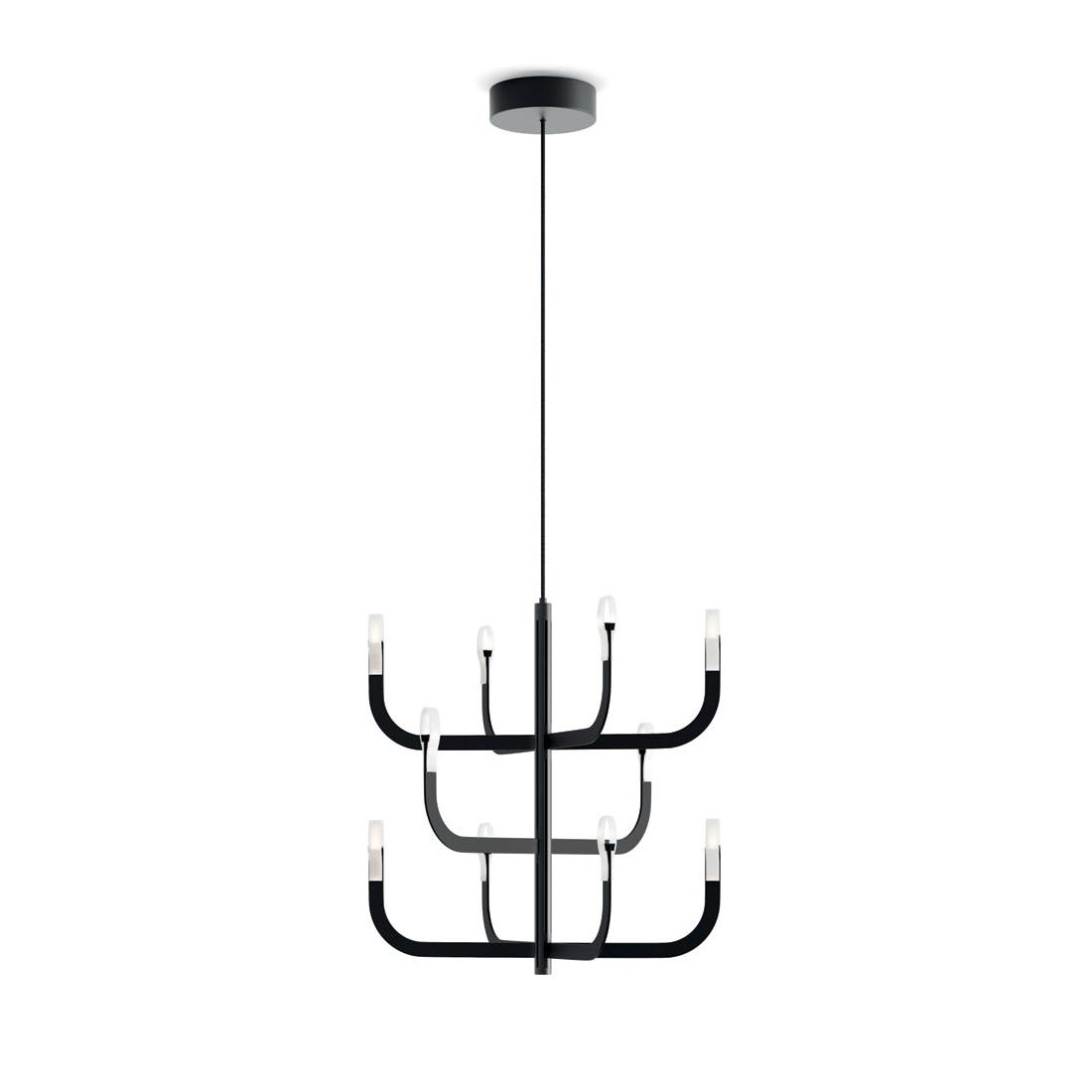 Luceplan propose une nouvelle vision du chandelier traditionnel dans laquelle l'innovation technologique, la recherche sur les matériaux et les nouvelles solutions pour la conduction de l'électricité sont totalement dissimulées. J-us revisite le concept et le réinterprète de manière contemporaine, sinon futuriste. La structure centrale cylindrique de 28 mm de diamètre forme un rail électrifié original qui peut accueillir les différents bras du chandelier, offrant ainsi un large choix de configurations. Les bras sont réalisés en matériau multicouche habituellement utilisé pour produire les circuits électroniques et qui permet de conduire le courant de manière pratique et fonctionnelle. Les LED intégrées restituent un éclairage chaleureux et accueillant qui évoque en mémoire la lumière des bougies. Le cadre est en aluminium, les bras sont en cuivre et en fibre de verre, et les diffuseurs sont en technopolymère. LED integrée: 33W, 2700K, CRI 90.