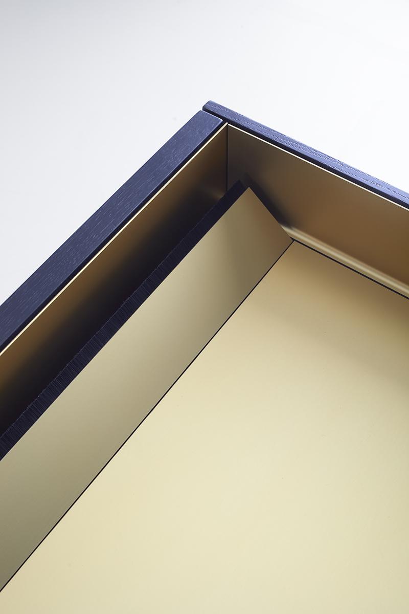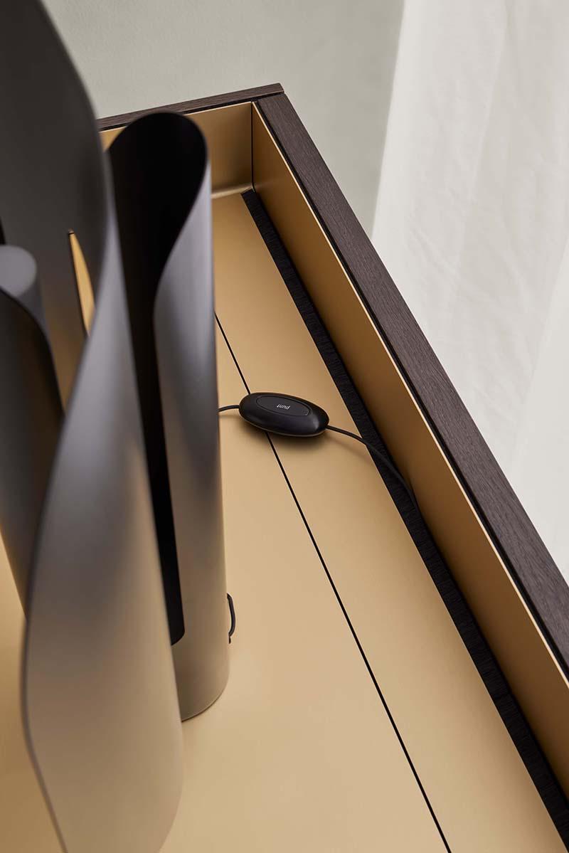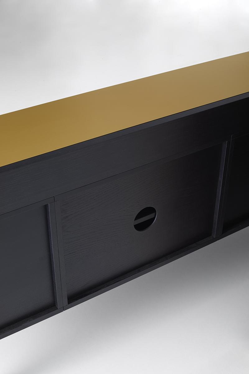 Collection de buffets, commodes et meubles de télévision lauréats du prix Red Dot 2015 avec une finition spéciale d’aluminium en partie supérieure.