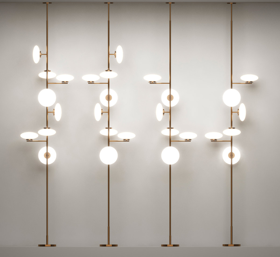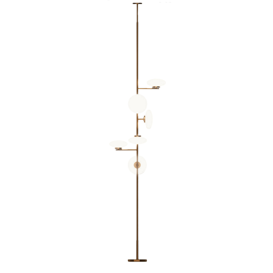Mamì Penta Light est une lampe sol – plafond extensible avec structure en métal verni noir opaque ou bronze brossé et abat-jours en verre soufflé blanc. LED integrées 6x6W, dimmer sur câble.