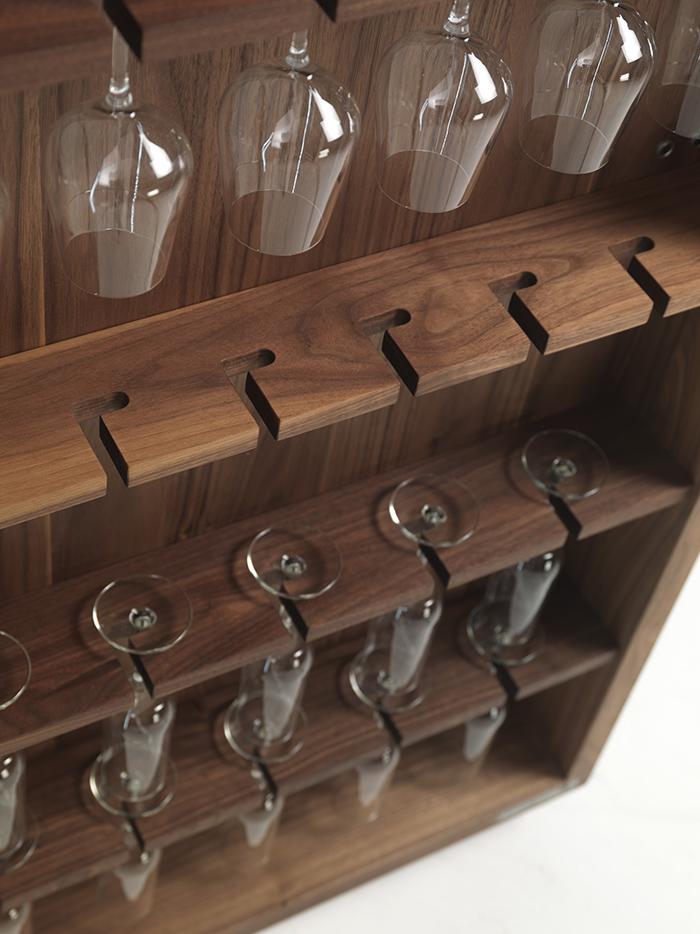 Les grandes portes sont la caractéristique principale de ce meuble: leur structure permet de ranger verres et objets de formats différents. Les compartiments intérieurs du meuble sont en outre éclairés grâce à un système de lumières à LED positionnées sur toute la hauteur de la structure intérieure. Leur allumage est automatique grâce à des détecteurs qui à l'ouverture de la porte activent les LED. Le meuble Cambusa, présenté ici en bois de noyer, est disponible aussi en chêne et en toutes les essences prévues par la Collection Riva 1920.