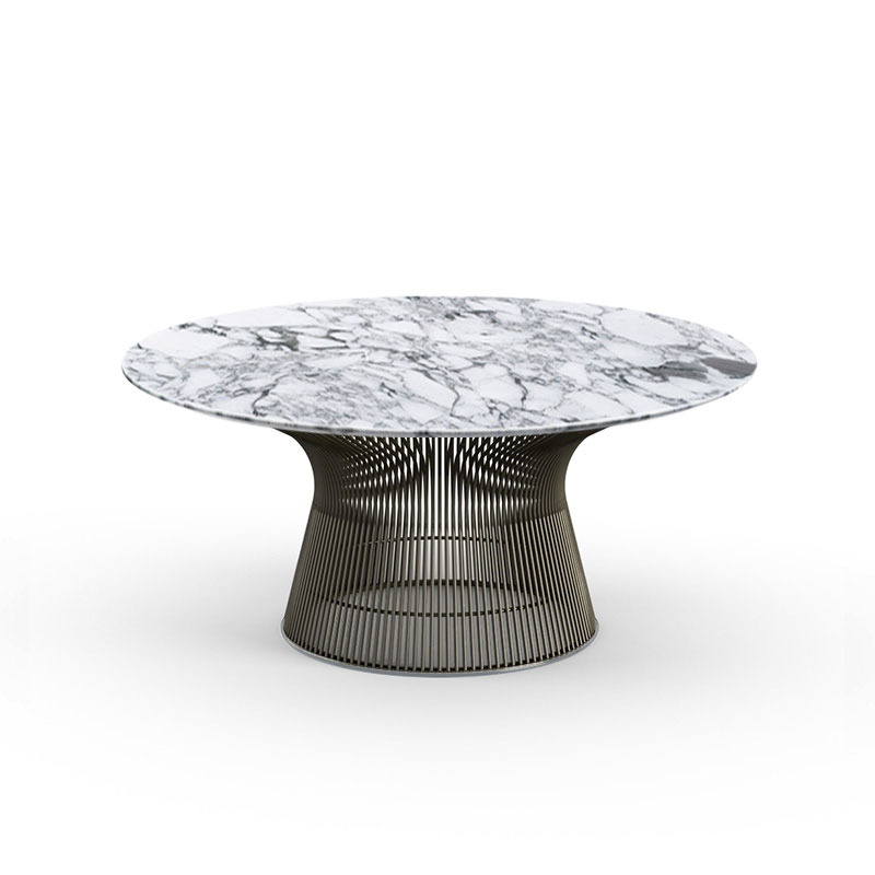 Knoll Platner est une collection réalisée par Warren Platner en 1962. Idéale pour un coin salon dans un bureau ou dans une maison. Disponible en version table à manger, guéridon et table basse. Le piètement est composé d'un faisceau de fils d'acier cintrés, soudés sur des cadres cintrés horizontaux en acier profilé. Finition nickel brillant avec vernis clair de protection, bronze métallisé ou or 18k. La base du piétement est un anneau de protection en profilé plastique, transparent. Le plateau est en verre trempé ou marbre.