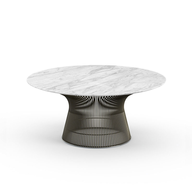Knoll Platner est une collection réalisée par Warren Platner en 1962. Idéale pour un coin salon dans un bureau ou dans une maison. Disponible en version table à manger, guéridon et table basse. Le piètement est composé d'un faisceau de fils d'acier cintrés, soudés sur des cadres cintrés horizontaux en acier profilé. Finition nickel brillant avec vernis clair de protection, bronze métallisé ou or 18k. La base du piétement est un anneau de protection en profilé plastique, transparent. Le plateau est en verre trempé ou marbre.