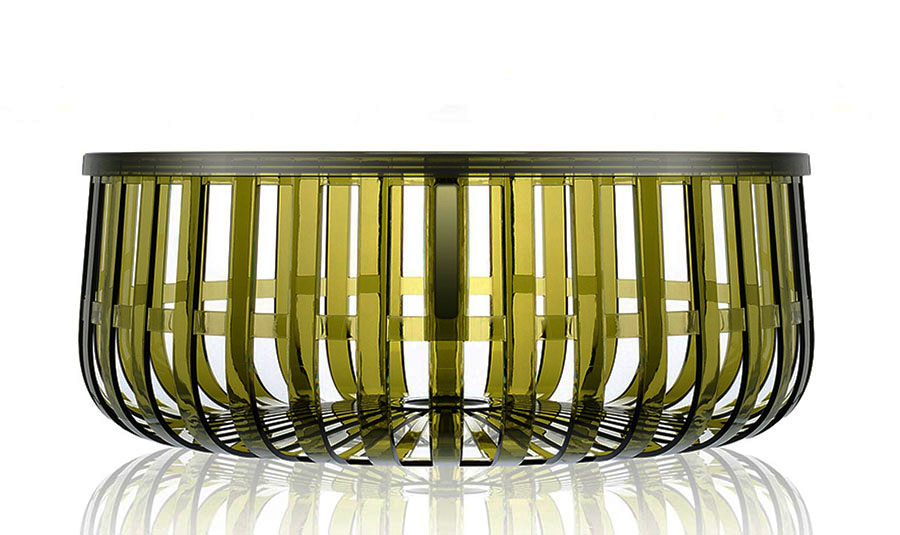 Panier è il primo oggetto firmato da Ronan e Erwan Bouroullec per Kartell. Una ricerca formale, tecnologica e funzionale: un cesto contenitore dalla forma semplice e allo stesso tempo molto comunicativa. Costituito da quattro moduli, quattro quarti di cerchio trasparenti lucidi a raggi, che, uniti tra loro da giunti opachi, fissano le strutture con un semplice incastro. Il Panier è un contenitore che si può chiudere all’estremità con un coperchio trasparente in policarbonato e può trasformarsi così anche in un pratico tavolino d’appoggio o in un portariviste. Panier è in policarbonato trasparente, disponibile in diverse varianti colore, è pratico, eclettico e ha un aspetto gradevole e giocoso.