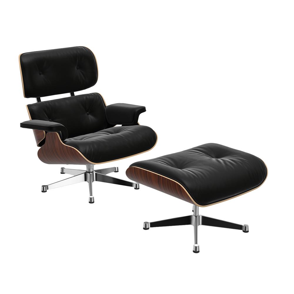 VITRA poltrona pelle nera EAMES LOUNGE CHAIR & OTTOMAN dimensioni classiche (Base lucida, struttura Santos Palissandro, Pelle Premium nera - Alluminio, legno e pelle)