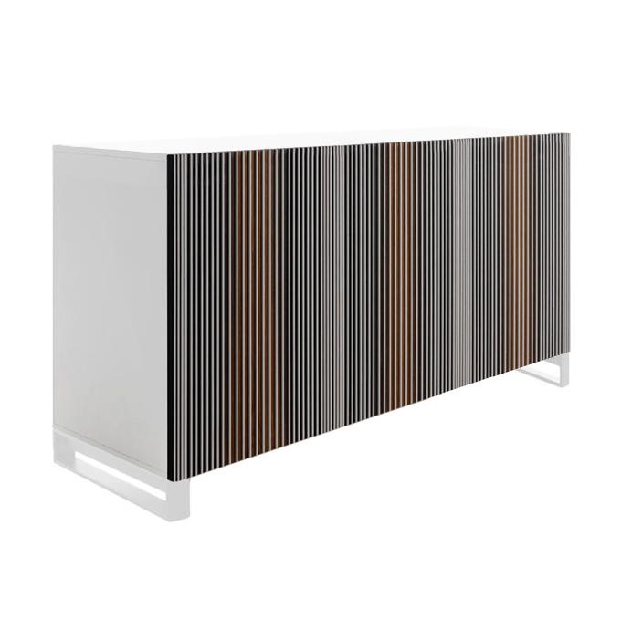 Struttura in pannelli di particelle di legno impiallacciati e tinti oppure nobilitati e laccati. Spessore struttura mm 18, schienale mm 10, divisorio verticale fisso mm 36. Ante in tamburato di MDF con rinforzi trasversali interni in metallo, impiallacciate in rovere termotrattato e fresate verticalmente per accogliere inserti verticali di laminato full-color bianco. Ripiani in vetro temperato trasparente, bordo filo lucido, spessore mm 5. Basamento Minimal Design in metallo verniciato. Accessori opzionali: ripiani in legno.