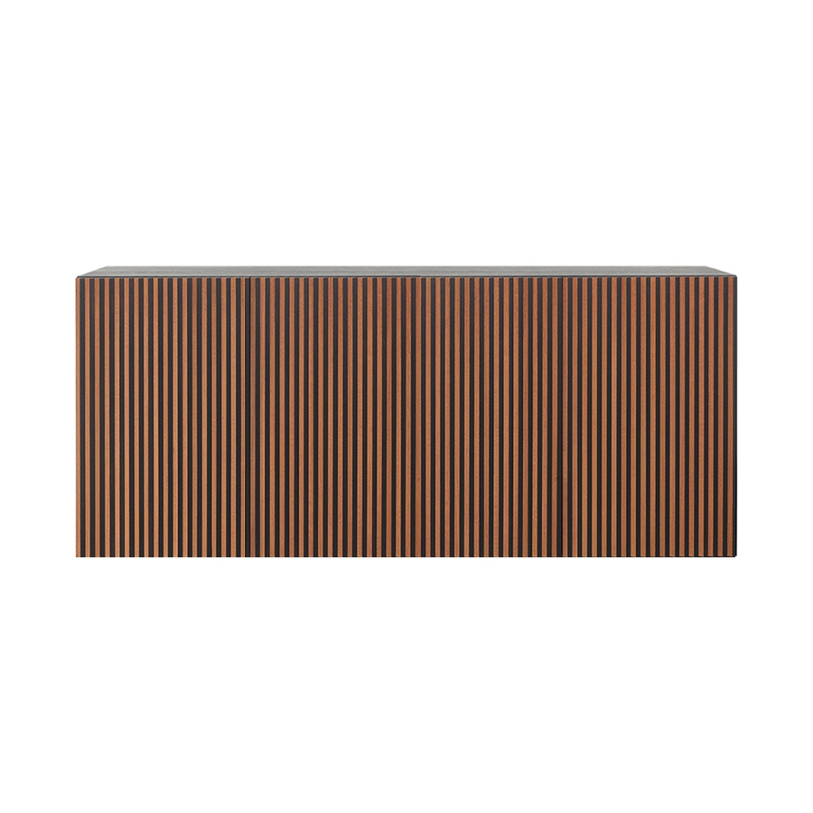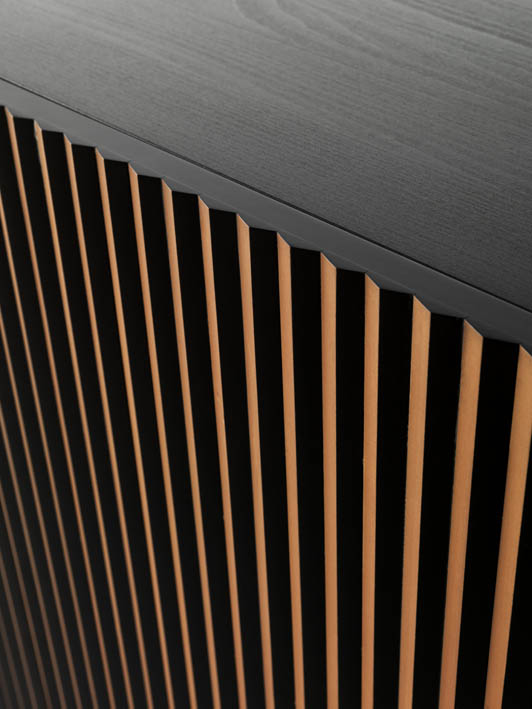 Struttura in pannelli di particelle di legno impiallacciati e tinti oppure nobilitati e laccati. Ante con inserti a sezione triangolare in legno di faggio tinto o laccato. Nella versione laccato bianco, ante in MDF sagomato. Ripiani in vetro temperato trasparente, bordo filo lucido, spessore mm 5. Piedini regolabili in ABS verniciato in finitura alluminio. Basamento opzionale, altezza cm 16 o cm 32, in ferro verniciato a polveri. Eventuali piccoli fori sulle stecche in massello nei frontali delle ante non sono da considerarsi difetto in quanto necessari al complesso processo di lavorazione.