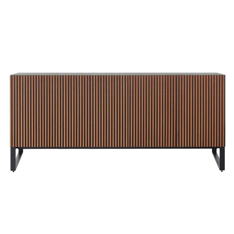 Struttura in pannelli di particelle di legno impiallacciati e tinti oppure nobilitati e laccati. Ante con inserti a sezione triangolare in legno di faggio tinto o laccato. Nella versione laccato bianco, ante in MDF sagomato. Ripiani in vetro temperato trasparente, bordo filo lucido, spessore mm 5. Basamento Minimal Design in metallo verniciato. Eventuali piccoli fori sulle stecche in massello nei frontali delle ante non sono da considerarsi difetto in quanto necessari al complesso processo di lavorazione.