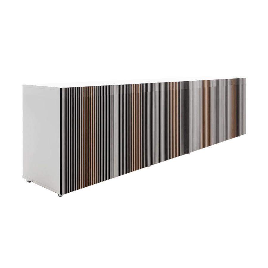 Struttura in pannelli di particelle di legno impiallacciati e tinti oppure nobilitati e laccati. Spessore struttura mm 18, schienale mm 10, divisorio verticale fisso mm 36. Ante in tamburato di MDF con rinforzi trasversali interni in metallo, impiallacciate in rovere termotrattato e fresate verticalmente per accogliere inserti verticali di laminato full-color bianco. Ripiani in vetro temperato trasparente, bordo filo lucido, spessore mm 5. Piedini regolabili in ABS verniciato in finitura alluminio. Basamento opzionale, altezza cm 16 o cm 32, in ferro verniciato a polveri. Accessori opzionali: ripiani in legno.