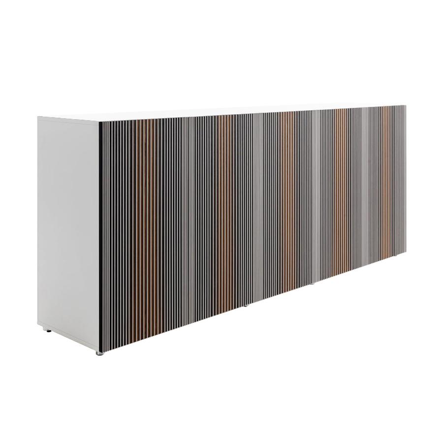 Struttura in pannelli di particelle di legno impiallacciati e tinti oppure nobilitati e laccati. Spessore struttura mm 18, schienale mm 10, divisorio verticale fisso mm 36. Ante in tamburato di MDF con rinforzi trasversali interni in metallo, impiallacciate in rovere termotrattato e fresate verticalmente per accogliere inserti verticali di laminato full-color bianco. Ripiani in vetro temperato trasparente, bordo filo lucido, spessore mm 5. Piedini regolabili in ABS verniciato in finitura alluminio. Basamento opzionale, altezza cm 16 o cm 32, in ferro verniciato a polveri. Accessori opzionali: ripiani in legno.