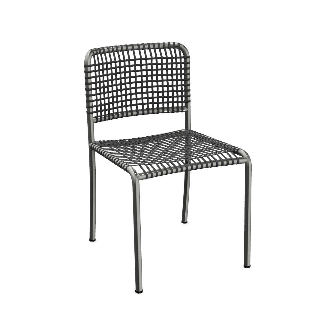Sedia con struttura impilabile in tubolare di alluminio anodizzato, intrecciata in pergamena naturale (ALLU 23 I) o grigia (ALLU 223 I).