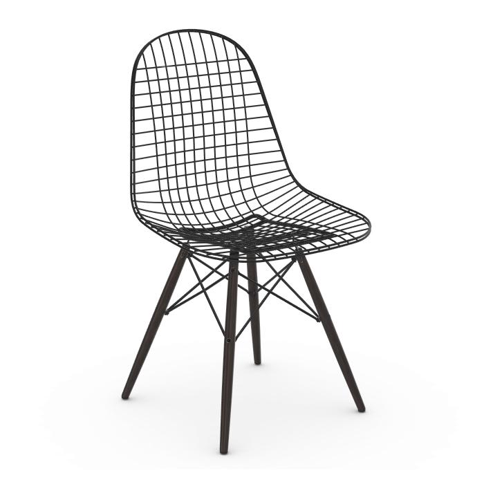 Le Wire Chairs di Charles e Ray Eames devono la loro trasparenza alla scocca in filo di acciaio saldato a punti, mentre la base in legno della DKW (Dining Chair K-Wire Wood Base) conferisce una nota di calore che contrasta con l‘aspetto essenzialmente tecnico del design. I componenti metallici della sedia DKW presentano una finitura verniciata a polvere in colore nero; le gambe in legno della base sono disponibili in varie tonalità di acero.