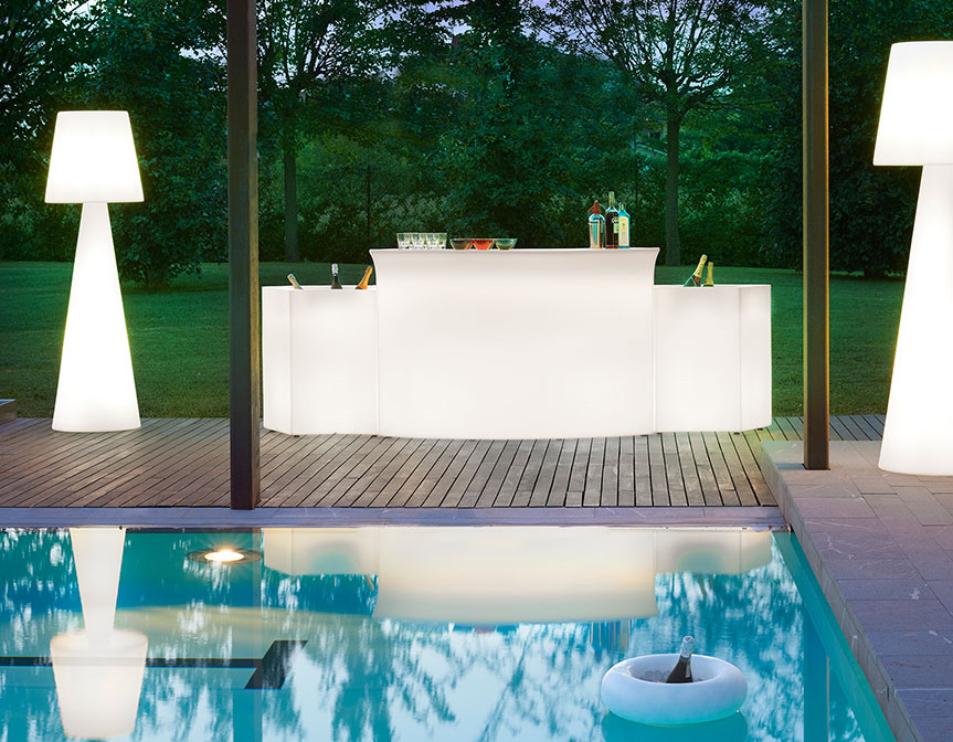 Ice Bar è il complemento d'arredo modulare, versatile e innovativo che si inserisce nella collezione dei sistemi espositivi firmati SLIDE. Realizzati in polietilene secondo la consueta tecnica dello stampo rotazionale. Lampadine a risparmi energetico: 1xE27 - 25W.