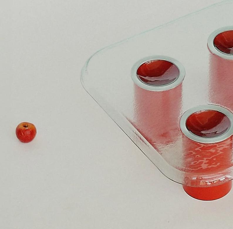 DRIADE tavolino COUPELLE (Piano chiaro e gambe arancio sanguigno RAL 2002 - Vetro e acciaio verniciato)