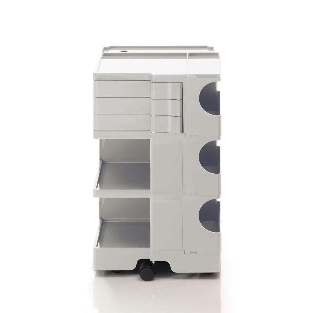 Icona storica del design, il carrello contenitore Boby B-Line si distingue per l’approccio dinamico e l’elevata versatilità. Progettato per garantire una facile componibilità verticale, permette di ottenere configurazioni diverse con capienze personalizzate. La struttura in ABS, composta da moduli con cassetti e ripiani, è montata su 5 ruote piroettanti in polipropilene e offre 4 soluzioni in termini di altezza. Parte della collezione permanente del MoMA di New York e della Triennale di Milano, Premio Smau nel 1971. Su richiesta è possibile acquistare il ripiano in multistrato di legno o sughero.