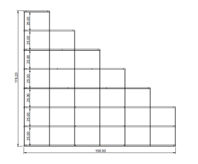 In questa composizione la libreria viene proposta con larghezza 199 cm e altezza 178,20 cm, composta da 7 elementi orizzontali, come evidenziato nell'immagine principale.