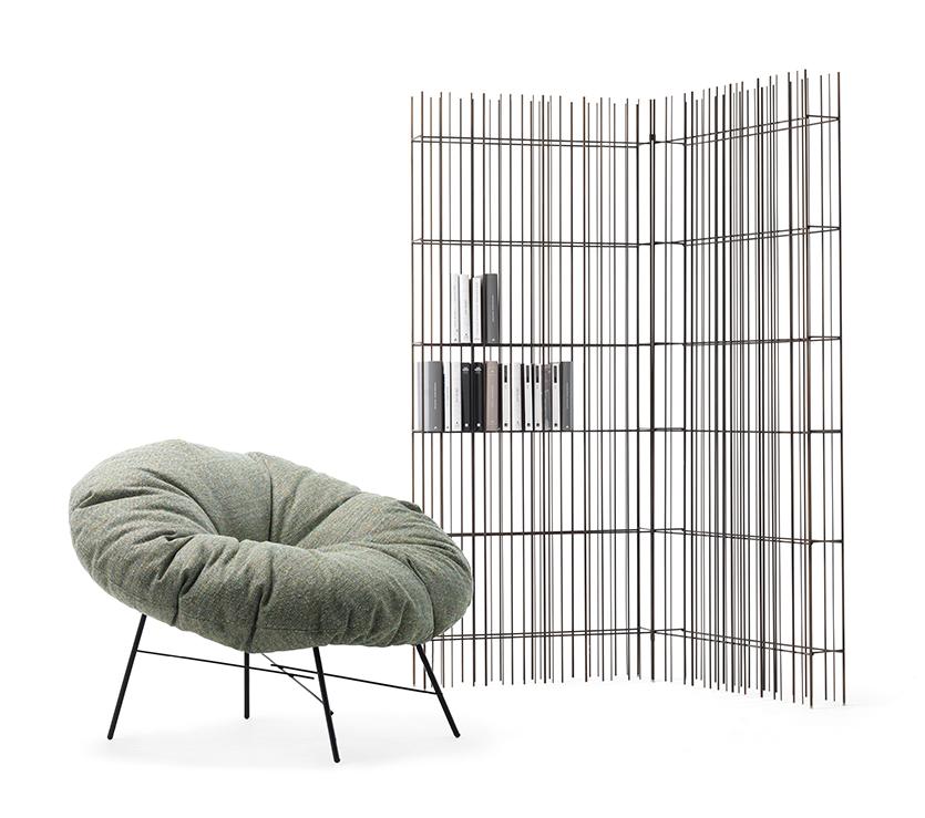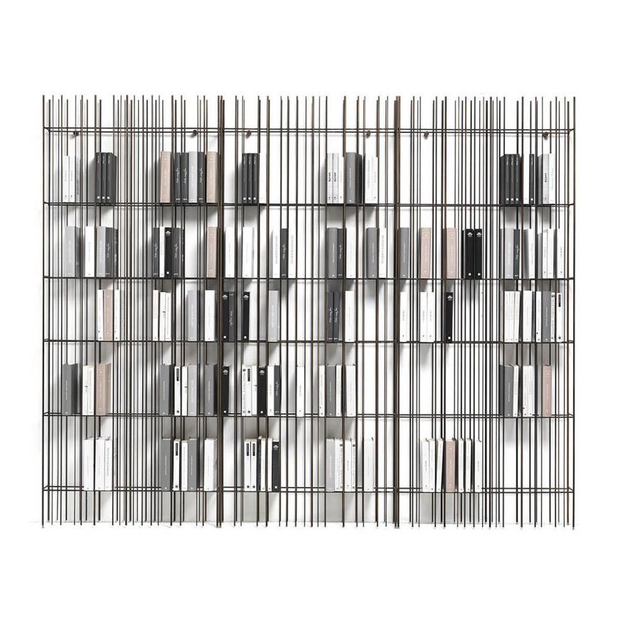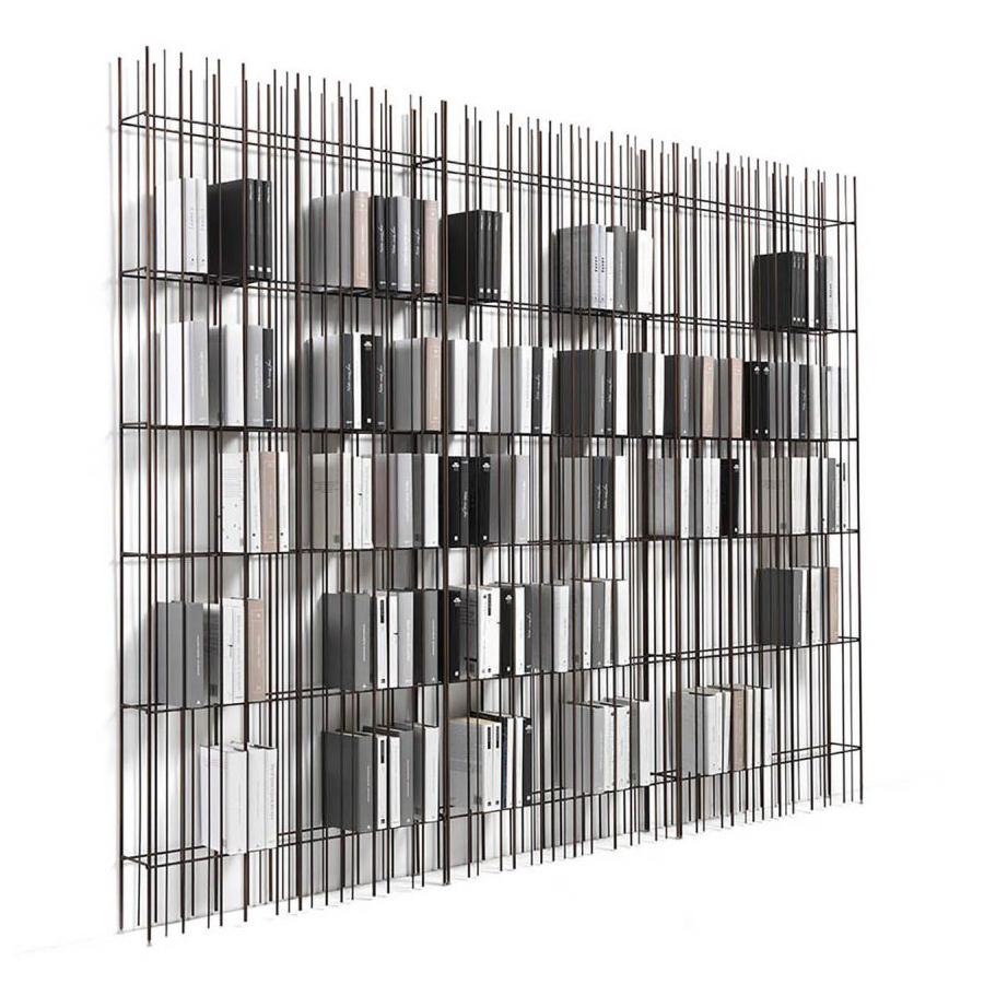 Metrica Mogg è una libreria in metallo disponibile nelle finiture titanio, brunito e oro con ripiani in cristallo trasparente disponibili in bronzo o verde. La struttura è semplice, il ritmo è scandito dalle bacchette di ferro fissate a diversi intervalli su una struttura apertamente rigorosa entro la quale i libri e gli oggetti inseriti ne completano la forma scrivendo di volta in volta nuove composizioni.