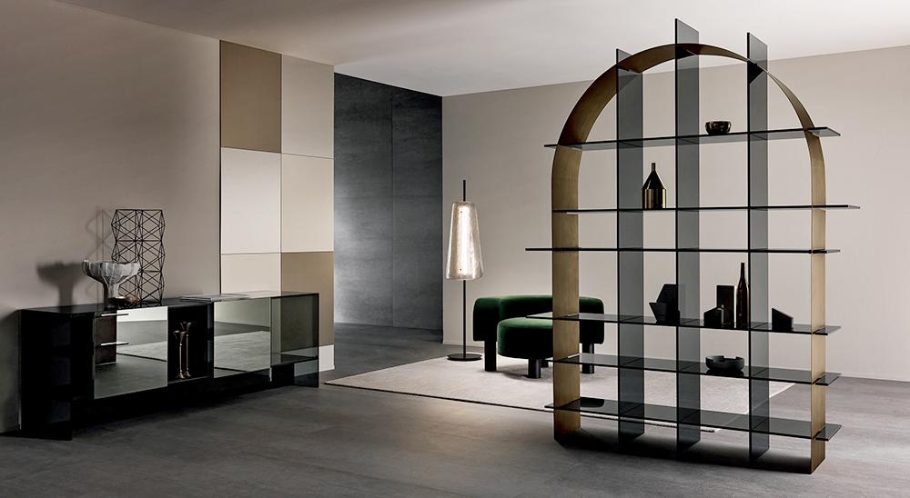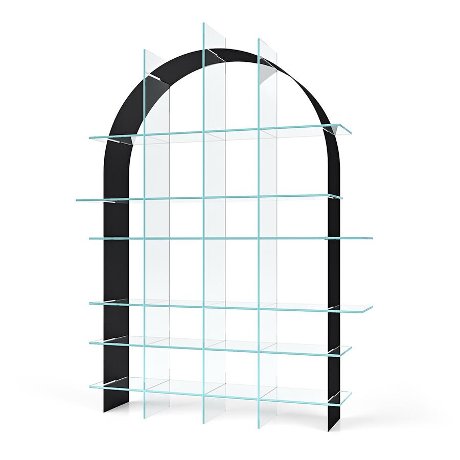 La libreria Paradigma Tonelli Design, Rrealizzata dallo studio di design e architettura Debonademeo Studio, è un arredo freestanding con struttura in vetro nelle varianti extrachiaro o fumé. La componente geometrica ad incastro di questa libreria di desgn è realizzata in lamiera sottile nella forma di arco o cerchio su richiesta in finitura bronzo spazzolato oppure nero spazzolato, e si abbina perfettamente anche agli ambienti più lussuosi. La libreria verticale autoportante Paradigma Tonelli Design è pensata per essere inserita in soggiorni e zone living, così come nell’ambiente studio. La sua altezza importante la rende perfetta per ambienti ampi e open space. Portata 30kg per ogni ripiano.
